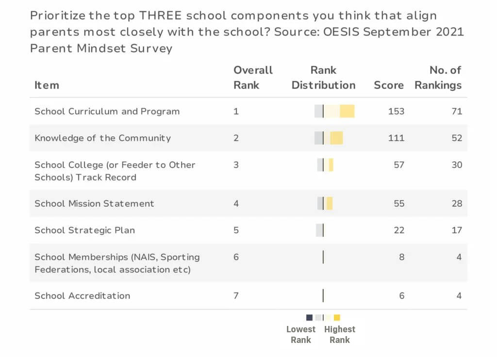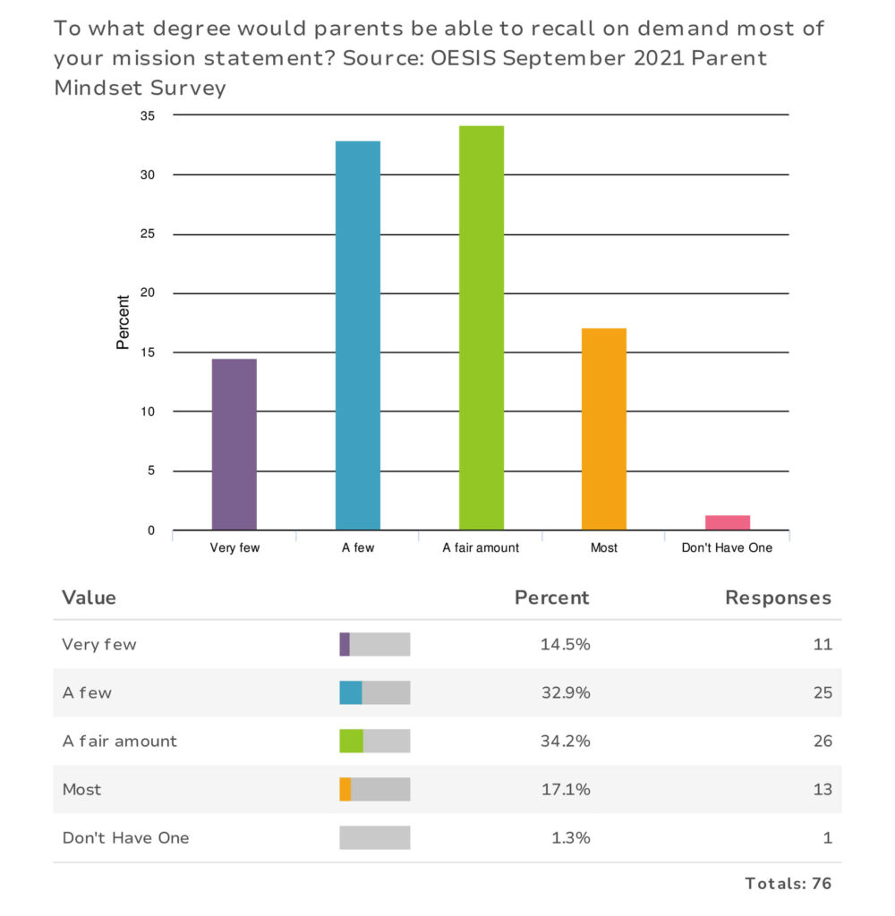 Sadly, schools have not met Drucker’s test because Boards, Heads, teachers, parents, and students, don’t know what the mission is, and if they do, are not aligned with what it says. We surveyed our schools about parent mindset with 75 school Heads and leaders responding (full report coming out shortly). Only 17.1% confirmed that most of their parents had strong familiarity with the mission. Digging into the responses, these very few schools that had strong parent familiarity with missions tended to be schools that knew who they are and what they are striving to be. See charts below: